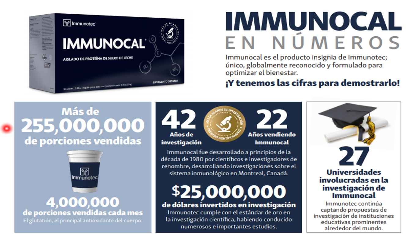 IMMUNOTEC es una organización de origen Canadiense “Ofrecemos productos de nutrición y bienestar de alta calidad, respaldados científicamente, que mejoran la calidad de vida y el rendimiento. Cuarenta años de investigación son la base del producto estrella Immunocal®. Sus innovaciones pioneras han dado como resultado numerosas patentes, tanto en América del Norte, como alrededor del mundo.